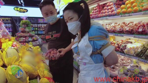 両手の縛られているお姉ちゃんは、お客さんに買い物をガイド。